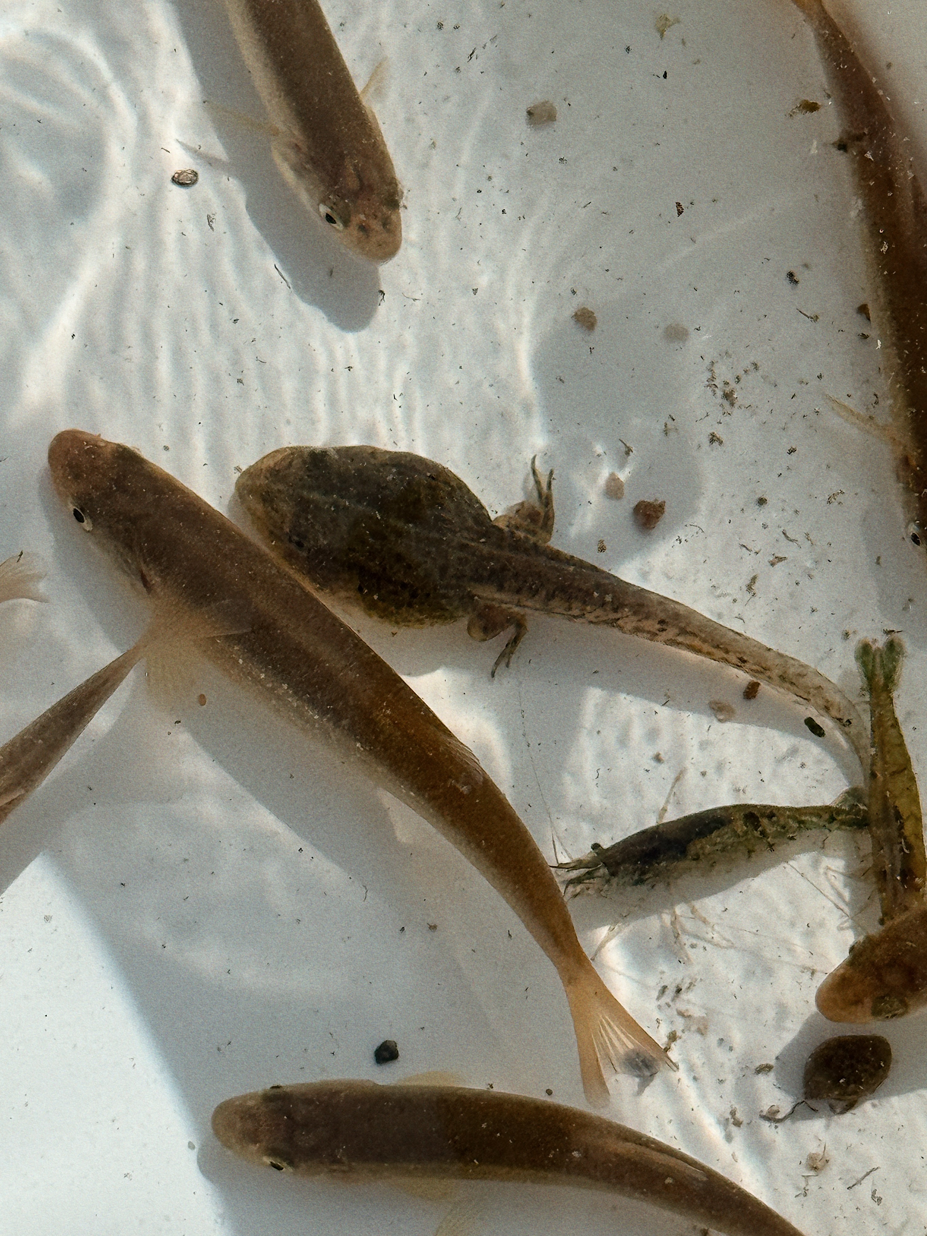 물속에는 작은 물고기, 올챙이, 개구리, 심지어 가재도 있었어요.