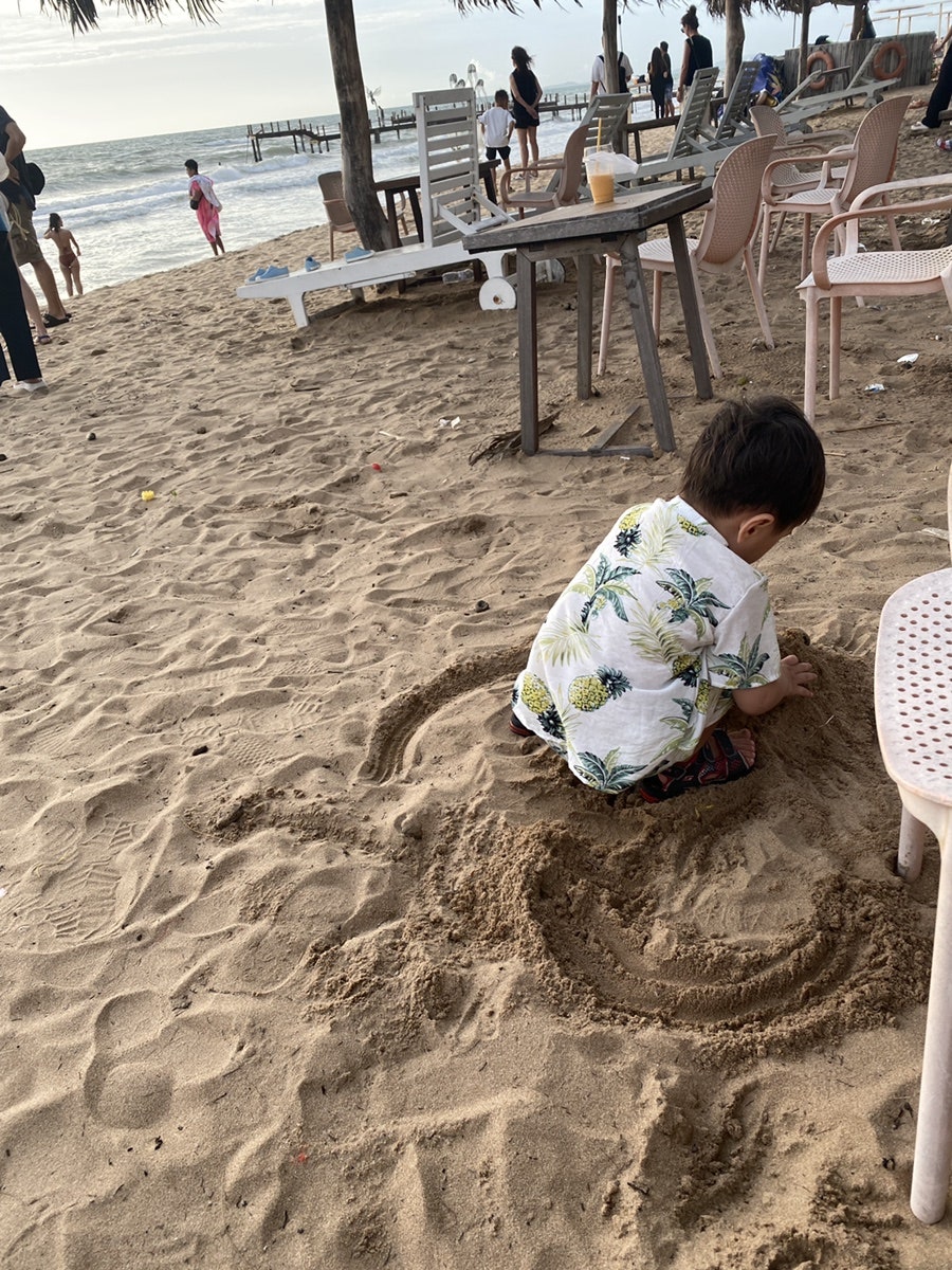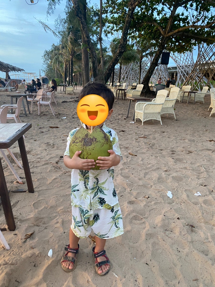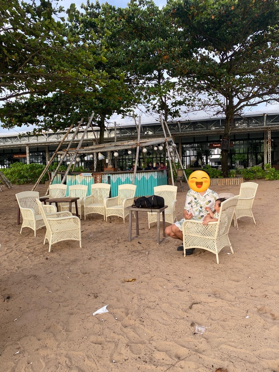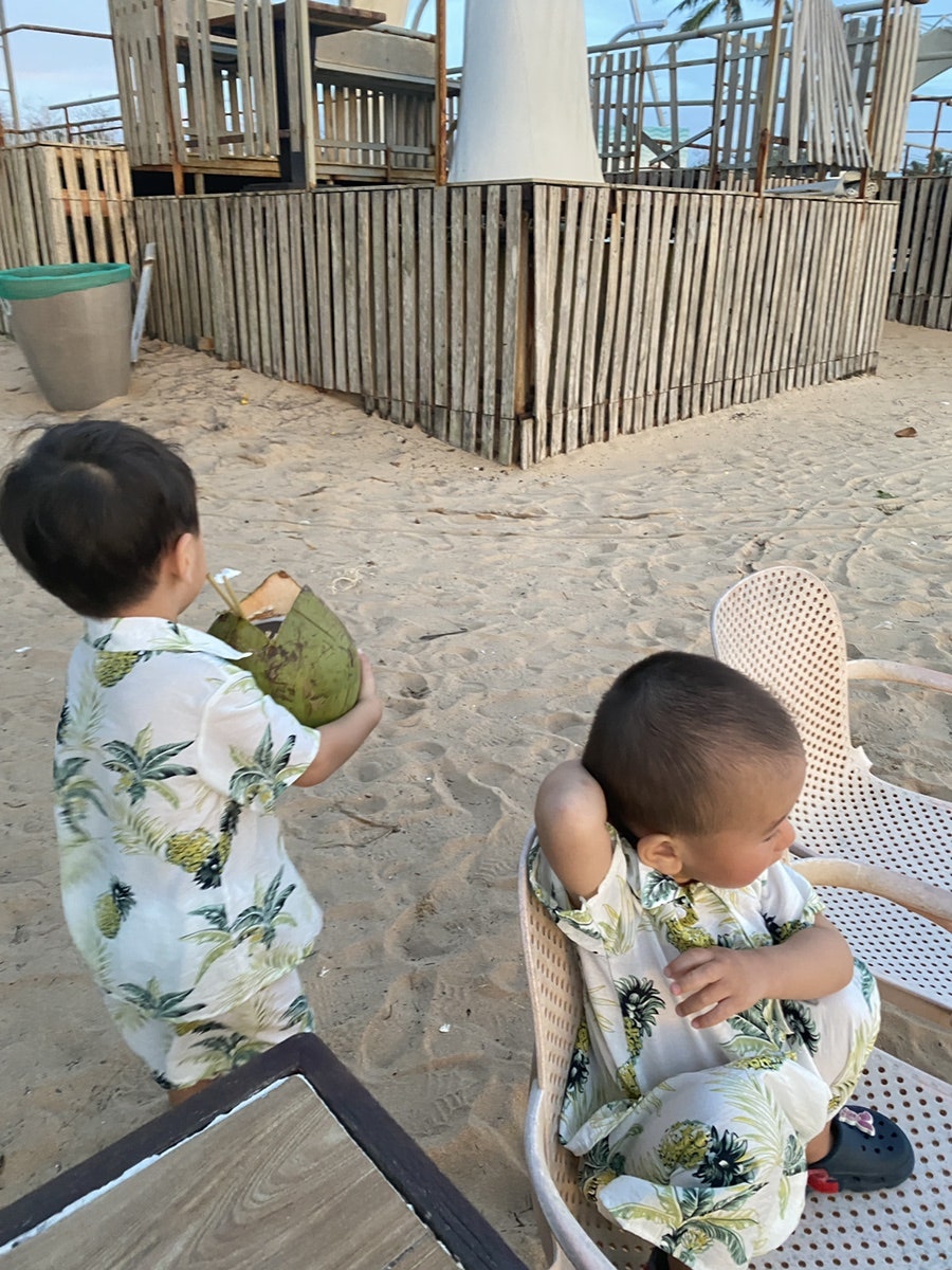 아이들은 모래사장에서 모래성을 쌓고, 저희는 카페에서 코코넛을 마시며 바다를 바라봤어요